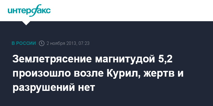 Южно-Сахалинск. 2 ноября. ИНТЕРФАКС-ДАЛЬНИЙ ВОСТОК - Землетрясение магнитудой 5,2 зарегистрировано в субботу рано утром в Тихом океане возле Курильских островов Сахалинской области, сообщили агентству "Интерфакс - Дальний Восток" на сейсмостанции "Южно-Сахалинск".
