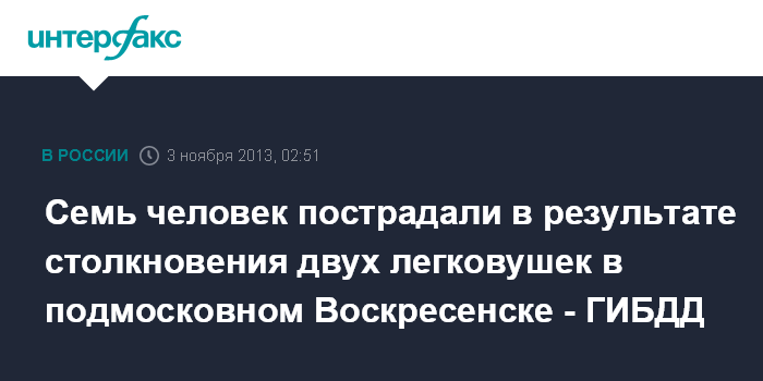Москва. 3 ноября. ИНТЕРФАКС - Семь человек, включая двоих детей, пострадали в ДТП в подмосковном Воскресенске, сообщила "Интерфаксу" начальник пресс-службы УГИБДД Московской области Мария Соленова.