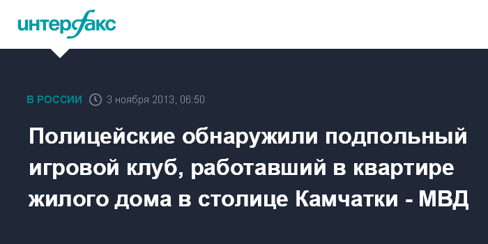 Петропавловск-Камчатский. 3 ноября. ИНТЕРФАКС - ДАЛЬНИЙ ВОСТОК - Полицейские закрыли подпольный игровой клуб в Петропавловске-Камчатском, сообщает в воскресенье пресс-служба УМВД по Камчатскому краю.