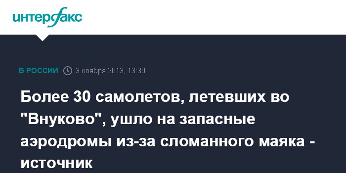 Москва. 3 ноября. INTERFAX.RU - Свыше 30 самолетов, летевших во "Внуково" вынуждены были уйти на запасные аэродромы из-за неработающего радиомаяка и низкой облачности, сообщил в воскресенье "Интерфаксу" источник в авиадиспетчерских службах московского авиаузла. "Низкая облачность не позволяет командирам совершить посадку во "Внуково" без применения радиомаяка, а в связи с тем, что вышедший на минувшей неделе из строя радиомаяк до сих пор не введен в эксплуатацию, командиры принимают решение об уходе на запасные аэродромы", - отметил источник.