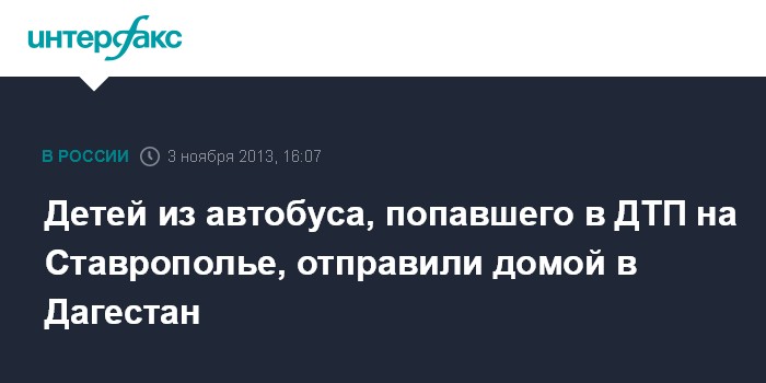 Пятигорск. 3 ноября. INTERFAX.RU - Детей из автобуса, который попал в ДТП на Ставрополье в воскресенье, в сопровождении сотрудников ГИБДД и психологов отправили домой в Дагестан, сообщил руководитель пресс-службы Северо-Кавказского регионального центра МЧС России Кантемир Давыдов. "В пути помощь ребятам будут оказывать специалисты Северо-Кавказского филиала Центра экстренной психологической помощи МЧС России", - сообщил К.Давыдов агентству "Интерфакс-Юг".