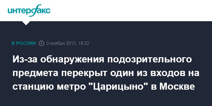 Москва. 3 ноября. ИНТЕРФАКС - Полиция перекрыла один из входов на станцию московского метро "Царицыно", сообщили "Интерфаксу" в пресс-службе столичного главка полиции в воскресенье вечером.