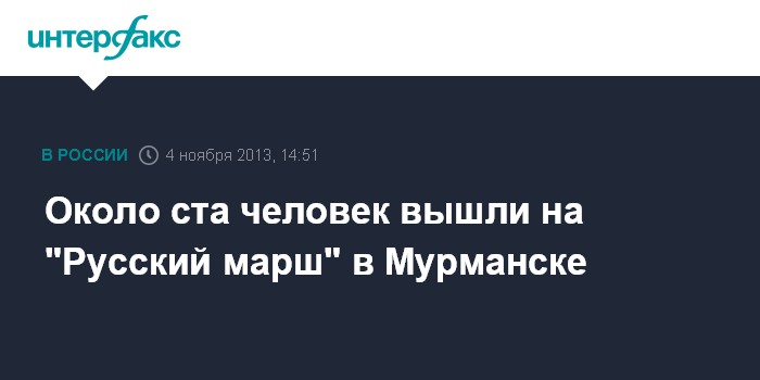 Мурманск. 4 ноября. INTERFAX.RU - Шествие и митинг в рамках согласованного с властями "Русского марша" прошли в Мурманске без происшествий, сообщили "Интерфаксу" в отделе полиции.