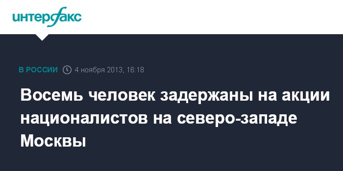 Москва. 4 ноября. INTERFAX.RU - Полиция сообщает о задержании восьми человек в ходе шествия и митинга националистов в северо-западном округе Москвы.