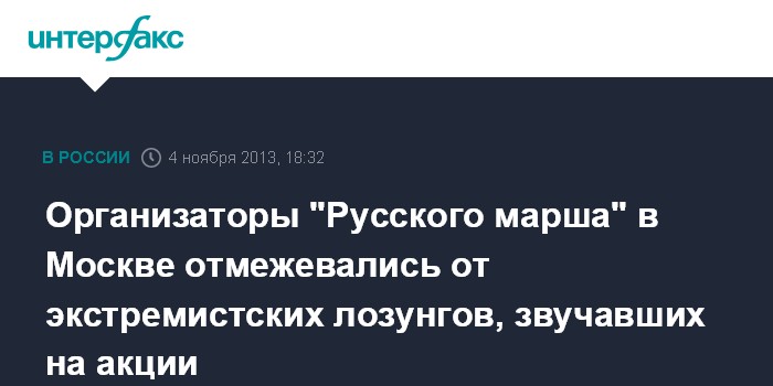 Москва. 4 ноября. INTERFAX.RU - Организаторы "Русского марша" в Москве осуждают участников акции, скандировавших экстремистские лозунги - таких было подавляющее меньшинство, заявил "Интерфаксу" лидер националистического объединения "Русские" Дмитрий Демушкин. "Мы сожалеем, что СМИ выискивали жаренное в Русском марше, пытались поймать одного "зигомета" в многотысячной толпе или отдельных личностей, которые пытались спровоцировать беспорядки. 99% участников Русского марша - абсолютно нормальные русские люди", - сказал Д.Демушкин.