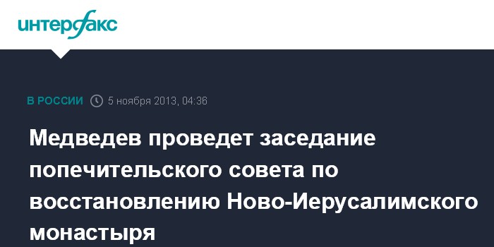 Москва. 5 ноября. ИНТЕРФАКС - Премьер-министр России Дмитрий Медведев посетит во вторник Воскресенский Ново-Иерусалимский монастырь (Истра, Подмосковье) и проведет 5-е заседание Попечительского совета по его восстановлению.