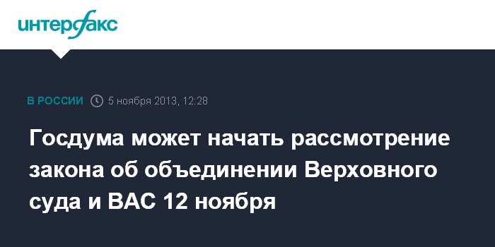 Москва. 5 ноября. INTERFAX.RU - Профильный комитет Госдумы предложил нижней палате рассмотреть в первом чтении президентский законопроект об объединении Верховного и Высшего арбитражного судов 12 ноября.