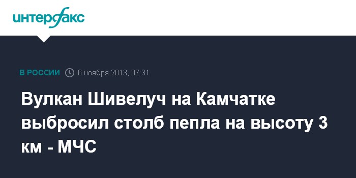 Петропавловск-Камчатский. 6 ноября. ИНТЕРФАКС - ДАЛЬНИЙ ВОСТОК - Вулкан Шивелуч, извергающийся на Камчатке, выбросил столб пепла на высоту 3 км над уровнем моря, сообщает в среду пресс-служба ГУ МЧС России по Камчатскому краю.