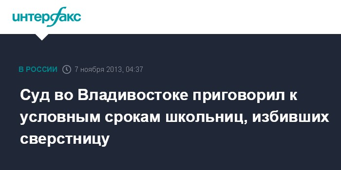 Владивосток. 7 ноября. ИНТЕРФАКС-ДАЛЬНИЙ ВОСТОК - Фрунзенский районный суд Владивостока приговорил двух школьниц условным срокам наказания за избиение сверстницы, видеозапись которого была выложена в интернете.