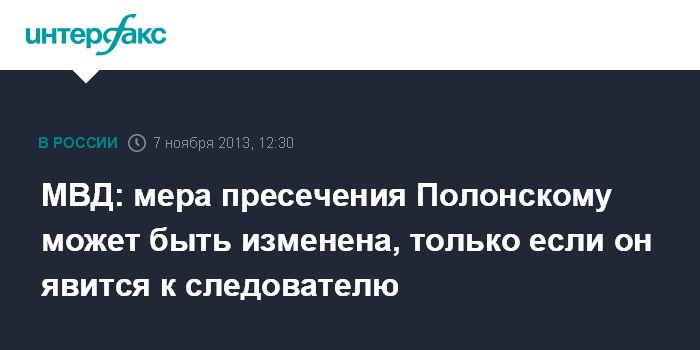Москва. 7 ноября. INTERFAX.RU - Следственный департамент МВД может рассмотреть вопрос об изменении меры пресечения предпринимателю Сергею Полонскому только в том случае, если он приедет в Россию и явится к следователю, сообщили "Интерфаксу" в пресс-центре МВД в четверг.