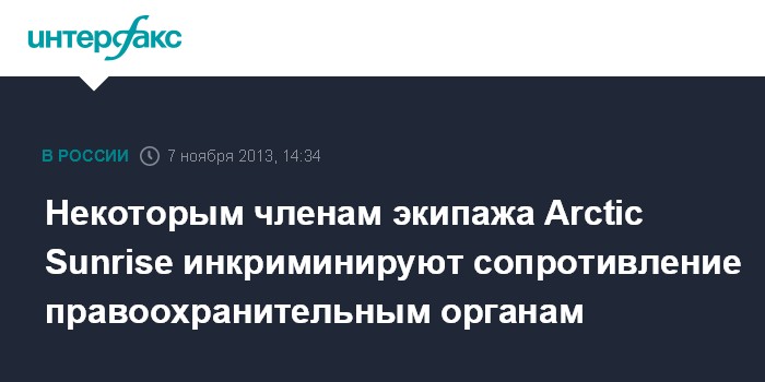 Москва. 7 ноября. INTERFAX.RU - Членам экипажа судна Arctic Sunrise, помимо хулиганства, будут предъявлены обвинения в сопротивлении силовым структурам, сообщил официальный представитель Следственного комитета Владимир Маркин.