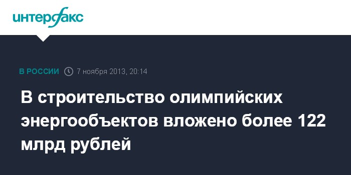 Москва. 7 ноября. INTERFAX.RU - На сегодняшний день в строительство олимпийских энергообъектов в Сочи вложено более 122 млрд руб., сообщил в интервью телеканалу "Россия 24" министр энергетики РФ Александр Новак.