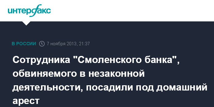 Москва. 7 ноября. INTERFAX.RU - Сотрудник ОАО "Смоленский банк", проходящий по уголовному делу о незаконной банковской деятельности, помещен под домашний арест на два месяца.