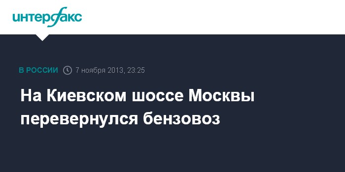 Москва. 7 ноября. INTERFAX.RU - На Киевском шоссе в районе съезда на Солнцево произошло ДТП, в результате которого, по предварительным данным, перевернулся бензовоз.