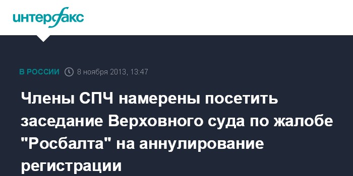 Москва. 8 ноября. INTERFAX.RU - Члены Совета по правам человека (СПЧ) при президенте России намерены посетить заседание Верховного суда, на котором будет рассматриваться кассационная жалоба информагентства "Росбалт", оспаривающая решение об аннулировании свидетельства о регистрации.