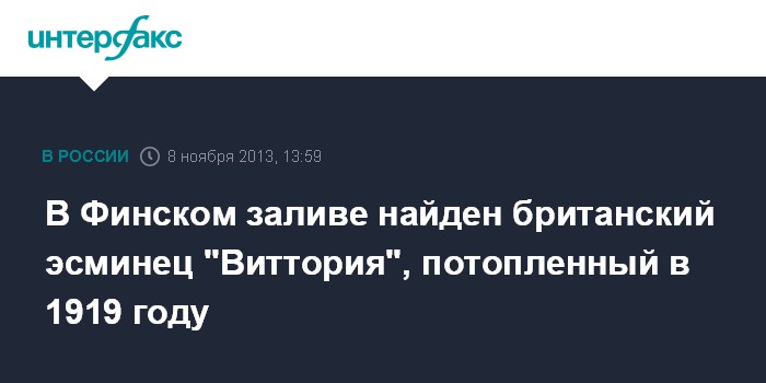 Санкт-Петербург. 8 ноября. INTERFAX.RU - Британский эскадренный миноносец "Виттория", потопленный в 1919 году русской подводной лодкой "Пантера", найден российскими водолазами в восточной части Финского залива, сообщил "Интерфаксу" в пятницу начальник пресс-службы Западного военного округа полковник Олег Кочетков.