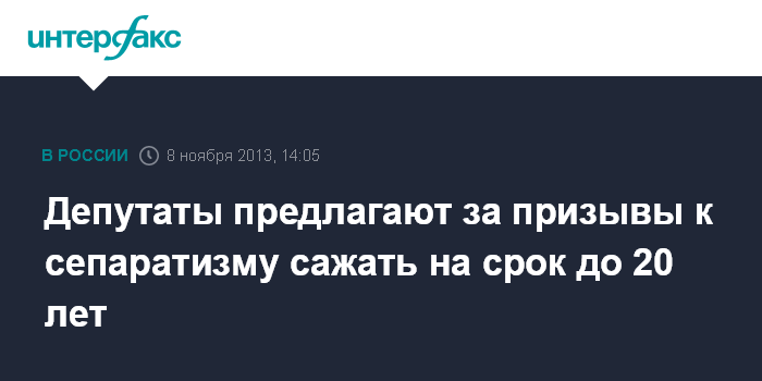 Москва. 8 ноября. ИНТЕРФАКС - В Госдуму России внесен законопроект, вводящий уголовную ответственность в виде лишения свободы на срок от трех до шести лет за пропаганду сепаратизма, а за организационную деятельность и публичные призывы к сепаратизму в СМИ и Интернете - до 20 лет.