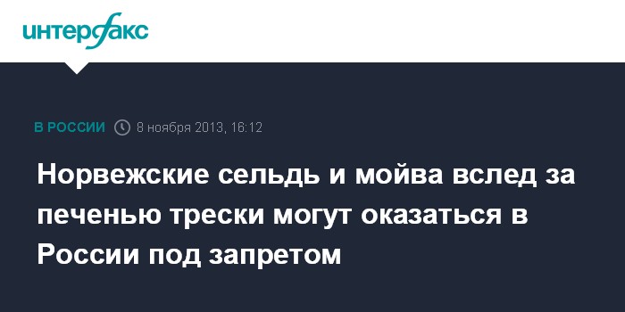 Москва. 8 ноября. INTERFAX.RU - Сельдь и мойва из Норвегии вслед за печенью трески могут оказаться в РФ под запретом. Такую возможность не исключает руководитель Россельхознадзора Сергей Данкверт.