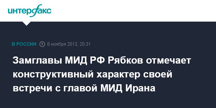 Женева. 8 ноября. INTERFAX.RU - Замглавы МИД РФ Сергей Рябков назвал конструктивной свою встречу с главой МИД Ирана Джавадом Зарифом и заявил, что она была направлена на поиск путей преодоления трудностей, существующих в ходе переговоров "шестерки" с Ираном.