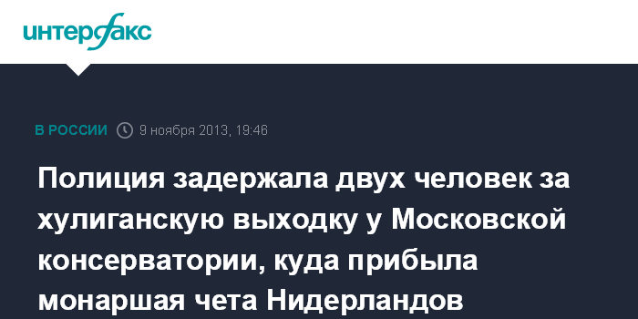 Москва. 9 ноября. INTERFAX.RU - Приезд короля и королевы Нидерландов в Московскую консерваторию, где в субботу проходит торжественная церемония закрытия Годов России в Нидерландах и Нидерландов в России, был омрачен несанкционированной выходкой молодого человека и девушки.