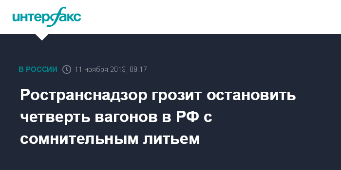 Москва. 11 ноября. INTERFAX.RU - Федеральная служба по надзору в сфере транспорта (Ространснадзор) РФ грозит останавливать грузовые вагоны железнодорожных операторов, которые до 16 декабря не примут меры для исключения из подвижного состава боковых рам с номерами, уже имеющимися у комплектующих на других вагонах, следует из информационного письма ведомства, опубликованного на его официальном сайте.