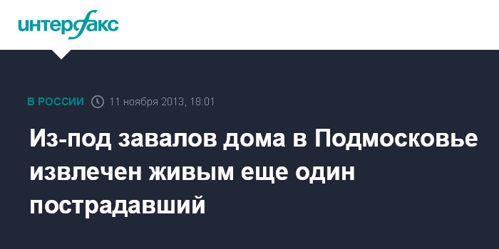 Москва. 11 ноября. INTERFAX.RU - Сотрудники экстренных служб в понедельник вечером извлекли живым одного пострадавшего из-под завалов разрушенного взрывом газа дома в Подмосковье, сообщил "Интерфаксу" источник в медицинских структурах региона.