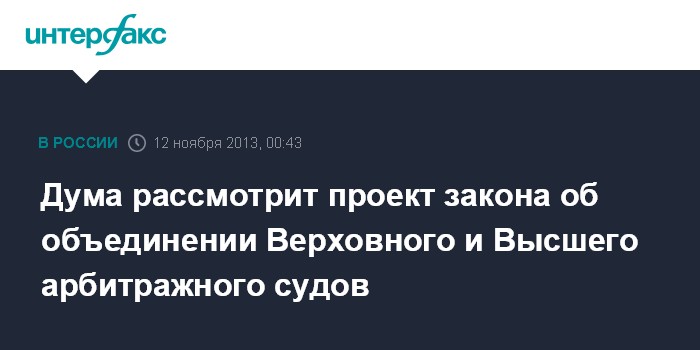 Москва. 12 октября. INTERFAX.RU - Госдума во вторник рассмотрит в первом чтении президентский законопроект об объединении Верховного Суда и Высшего арбитражного Суда РФ.