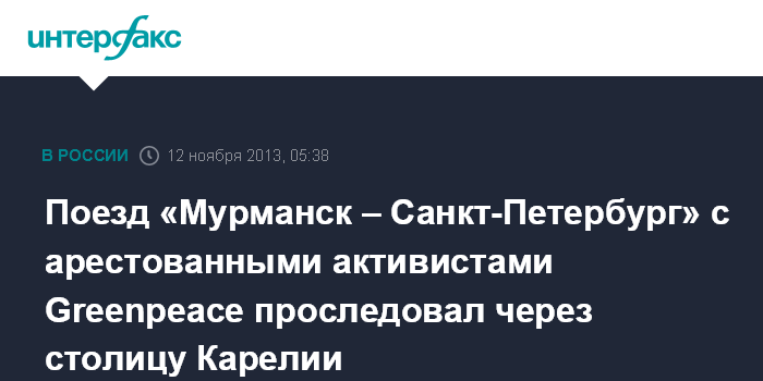 Петрозаводск. 12 ноября. ИНТЕРФАКС СЕВЕРО-ЗАПАД - Поезд «Мурманск – Санкт-Петербург», в котором перевозят членов экипажа судна Greenpeace Arctic Sunrise, арестованных в России по делу о хулиганстве на платформе "Приразломная", проследовал через столицу Карелии, передает корреспондент "Интерфакса".