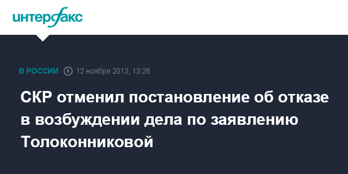 СКР отменил постановление об отказе в возбуждении дела по заявлению Толоконниковой