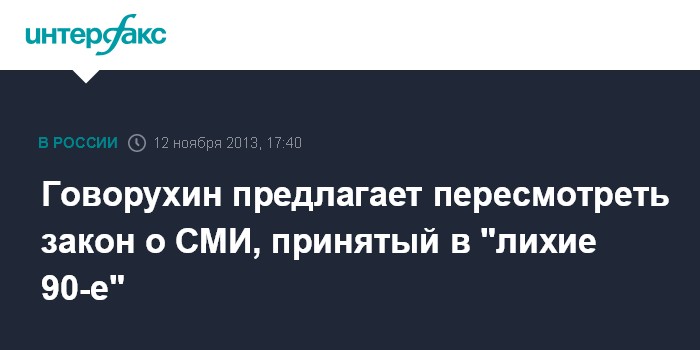 "Закон о СМИ вообще пора пересмотреть, потому что он делался в "лихие" 90-е годы. У нас демократическое государство, но спросите людей - довольны ли они российским телевидением и газетами? Отсюда вытекает, что пора на законодательном уровне эти пункты пересмотреть", - сказал Говорухин "Интерфаксу" во вторник.
