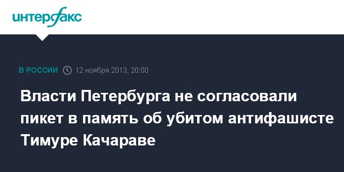 Санкт-Петербург. 12 ноября. INTERFAX.RU - Власти Петербурга не согласовали пикет в память об убитом в 2005 г. активисте-антифашисте Тимуре Качараве, сообщила пресс-служба антидискриминационного центра "Мемориал".