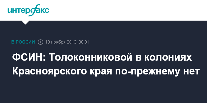 Красноярск. 13 ноября. INTERFAX.RU - Участницы панк-группы Pussy Riot Надежды Толоконниковой в колониях Красноярского края в настоящее время нет, сообщил агентству "Интерфакс" старший инспектор пресс-службы ГУ ФСИН по Красноярскому краю Евгений Бельский.