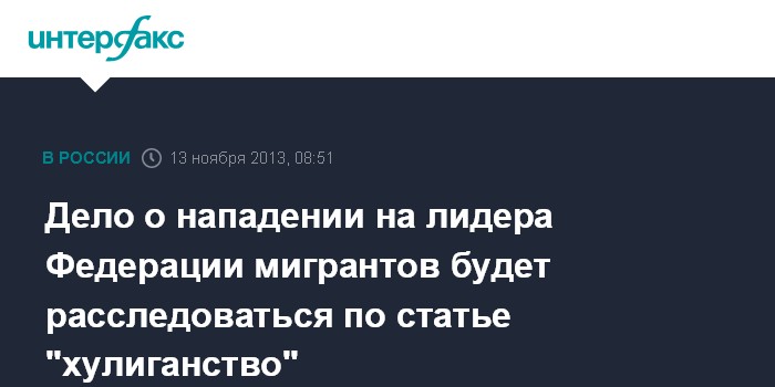 Москва. 13 ноября. INTERFAX.RU - Следствие расценило как хулиганство нападение на одного из руководителей Федерации мигрантов России Маиса Курбанова.