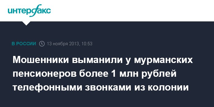 Мурманск. 13 ноября. INTERFAX.RU - Группа телефонных мошенников, уже отбывающих наказание в колониях, обманным путем вымогала деньги у мурманских пенсионеров, сообщила пресс-служба регионального УМВД.