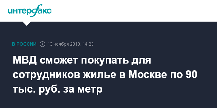Москва. 13 ноября. INTERFAX.RU - Правительство РФ разрешило МВД России приобрести в 2013 г. жилье в Москве для военнослужащих и сотрудников органов внутренних дел, исходя из стоимости 1 кв. метра 90 400 рублей.