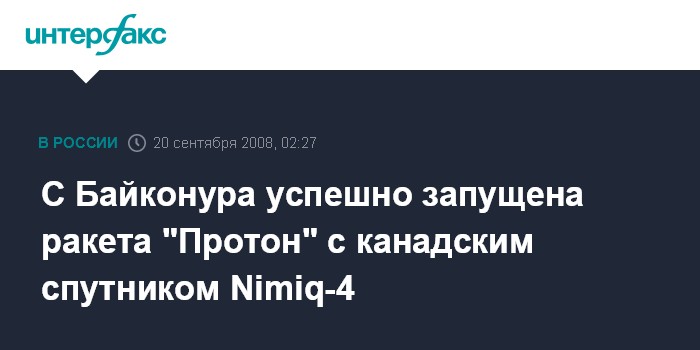 Байконур. 20 сентября. ИНТЕРФАКС-АВН - Российская ракета-носитель "Протон-М" с канадским телекоммуникационным аппаратом Nimiq-4 стартовала с космодрома Байконур (Казахстан).