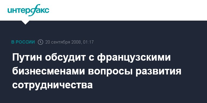 Сочи. 20 сентября. ИНТЕРФАКС - Премьер-министр России Владимир Путин в субботу встретится с российскими и французскими бизнесменами, а также примет участие в 13-ом заседании российско-французской комиссии по вопросам двустороннего сотрудничества на уровне глав правительств.
