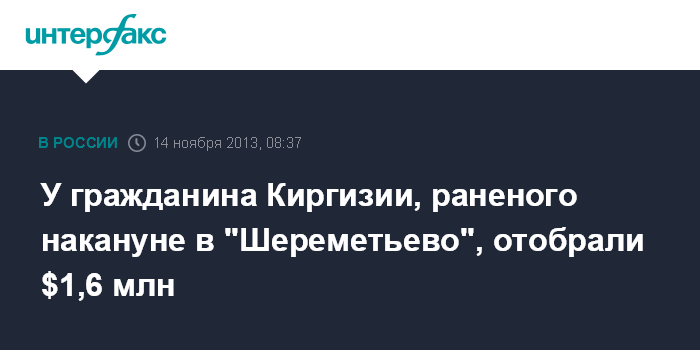 Москва. 14 ноября. INTERFAX.RU - Приезжий из Киргизии, пострадавший в результате разбойного нападения в аэропорту "Шереметьево", лишился $1,6 млн, сообщили в четверг "Интерфаксу" в пресс-центре МВД России.