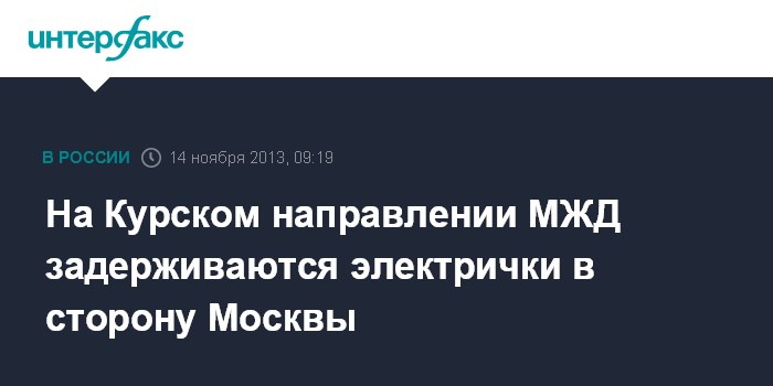 Москва. 14 ноября. INTERFAX.RU - Движение четырех электропоездов Курского направления МЖД, следующих в сторону Москвы, в утренние часы задерживается, сообщили "Интерфаксу" в пресс-центре столичного департамента транспорта и развития дорожно-транспортной инфраструктуры