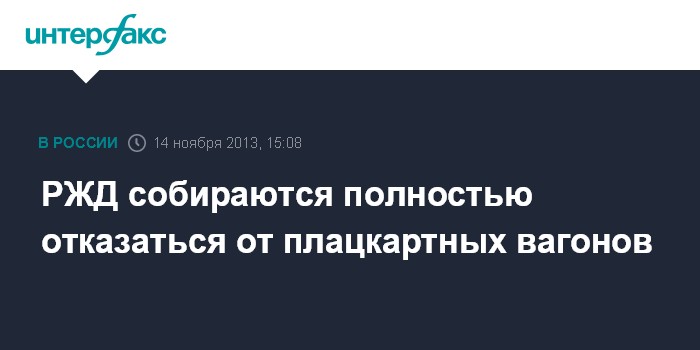 Москва. 14 ноября. INTERFAX.RU - "Российские железные дороги" планируют в ближайшие годы полностью отказаться от плацкартных вагонов, сообщил глава ОАО РЖД Владимир Якунин.