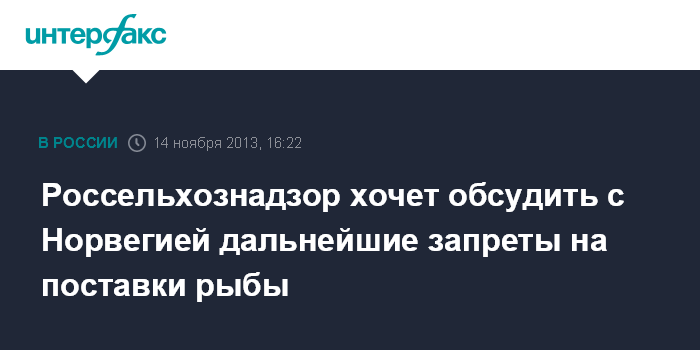 Москва. 14 ноября. INTERFAX.RU - Россельхознадзор предлагает Службе обеспечения пищевой безопасности Норвегии (Mattilsynet) обсудить введение временных ограничений на поставки отдельных видов рыбной продукции из Норвегии в Россию, говорится в сообщении российской ветслужбы.