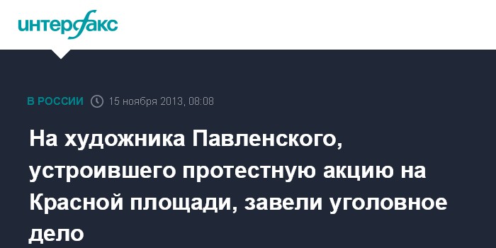 Москва. 15 ноября. INTERFAX.RU - Художник Петр Павленский, пригвоздивший себя к брусчатке Красной площади, стал фигурантом уголовного дела о хулиганстве, сообщили "Интерфаксу" в пресс-службе московской полиции.