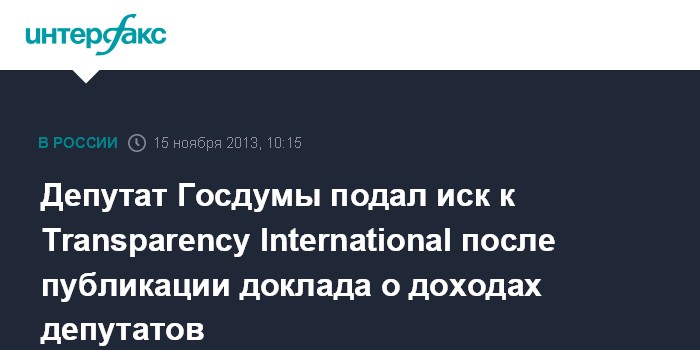 "Депутат требует опровержения информации, представленной в докладе "Вопросы к депутатам-2013", - сообщили "Интерфаксу" в пятницу в центре "Transparency International - Россия".