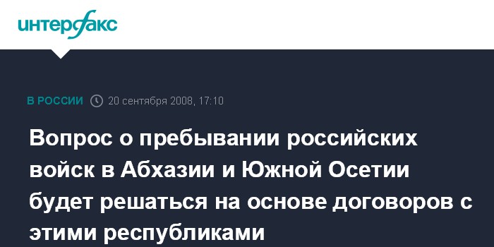 Москва. 20 сентября. INTERFAX.RU - Премьер-министр РФ Владимир Путин заявляет, что вопрос о нахождении на территории Абхазии и Южной Осетии Вооруженных сил России будет решаться в соответствии с международными договоренностями РФ с Сухуми и Цхинвали.