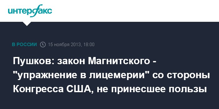 "Принятый год назад США так называемый закон Магнитского никому и ничем не помог, а так и остался упражнением в лицемерии со стороны американского Конгресса", - написал Пушков в своем микроблоге в Twitter.
