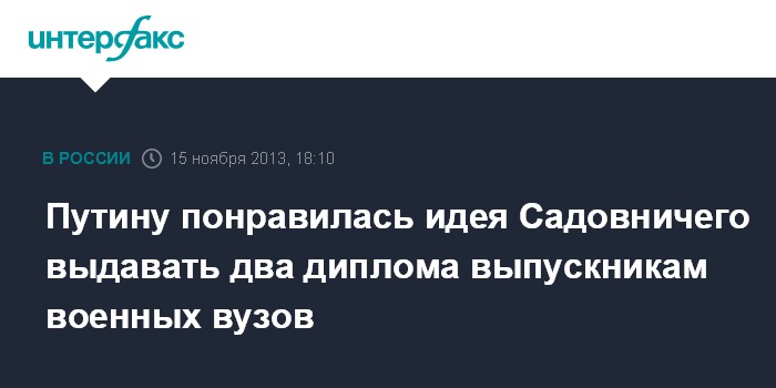Рязань. 15 ноября. INTERFAX.RU - Президент РФ Владимир Путин поддержал предложение ректора МГУ Виктора Садовничего о возможности выдачи заканчивающим военную академию двух дипломов - военного и гражданского.