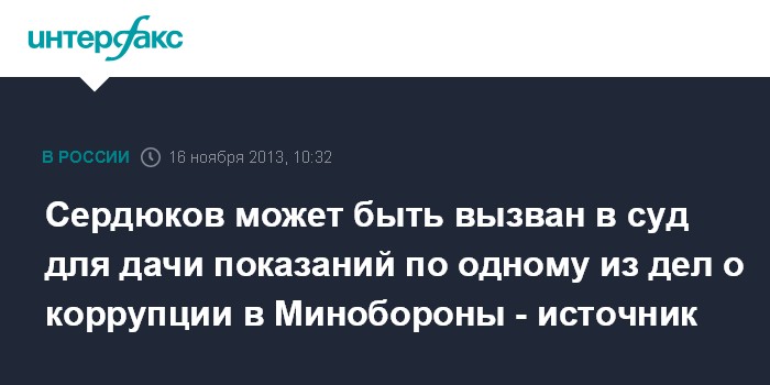 Москва. 16 ноября. INTERFAX.RU - Экс-министр обороны Анатолий Сердюков может быть вызван в суд для дачи показаний по одному из дел о коррупции в Минобороны, заявил "Интерфаксу" источник, знакомый с ситуацией. "Сердюков допрашивался в качестве свидетеля по делу экс-главы Центральной экспериментальной военно-картографической фабрики Минобороны Натальи Дыньковой и ее сына. Данные показания находятся в материалах дела, суд вправе вызвать Сердюкова для дачи показания",- сообщил источник.