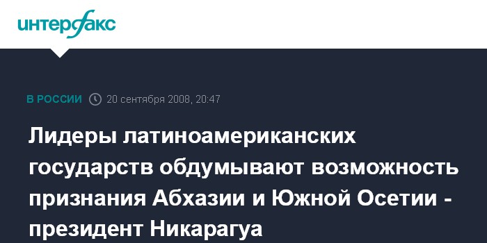 Вместе с тем он выразил уверенность, что независимость Абхазии и Южной Осетии будет признана государствами Латинской Америки. "У меня полная уверенность, что иного не дано", - подчеркнул никарагуанский лидер.
