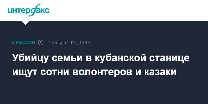 Москва. 17 ноября. INTERFAX.RU - Около ста поисковых групп, а также авиация полиции Кубани разыскивают подозреваемого в убийстве четырех человек в станице Староминской Краснодарского края, сообщается на сайте регионального ГУ МВД РФ. "В поисковых мероприятиях задействован весь личный состав ОМВД России по Староминскому району, а так же более 600 представителей общественности, 84 казака", - уточняется в сообщении.