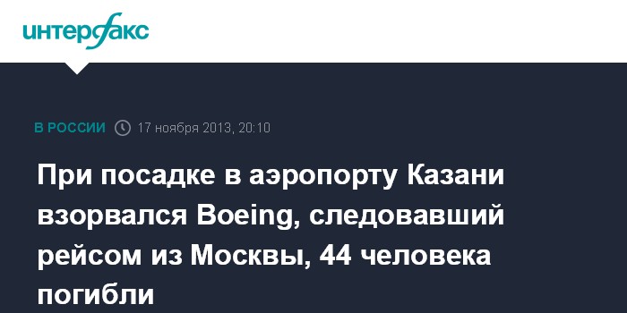 Казань. 17 ноября. INTERFAX.RU - В Казани при посадке в международном аэропорту "Казань" взорвался "Боинг", погибли 44 человека, сообщил агентству "Интерфакс-Поволжье" руководитель отдела пропаганды и общественных связей ГУ МЧС РФ по Татарстану Андрей Родыгин.